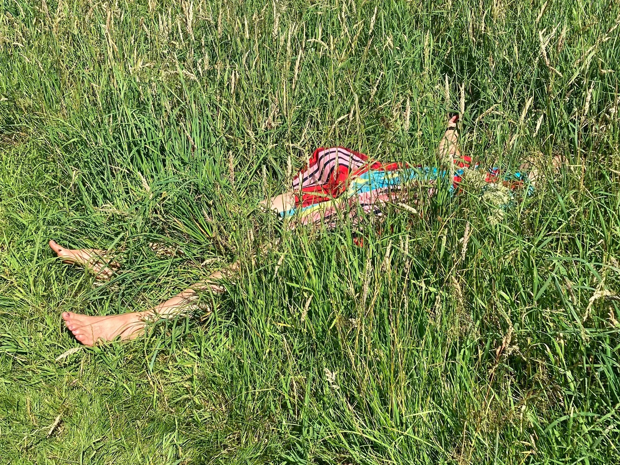 Lying down on the ground began as a simple act of finding connection to my surroundings that answered something within me that I was unconsciously seeking. Back to the earth, my brain and body level, a new awareness of what’s within and around me opened up. Lying down offers a direct physical and imaginative connection to the earth and its inhabitants. With brain and body on the same level, my senses become attuned to what is directly around me, feeling the earth at my back, the air on my skin and absorbing the light. I notice the details of soil, plants and insects. Above me I see the sky anew. Sometimes birds swoop across billowing clouds in a deep blue sky. On cloudy days apparently static clouds reveal themselves as dynamic layers, shifting and changing.